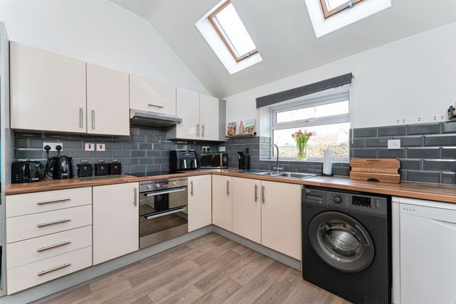 Window to front and rear. Door to rear. Vinyl flooring. Radiator. Undercounter oven, hob & cooker hood over. Storage cupboard. Tiled splashbacks. Single drainer sink with mixer taps. Space for freestanding washing machine.