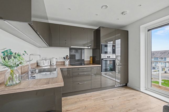 Internally, the apartment comprises a welcoming entrance hall with useful storage cupboards, leading through to a bright and spacious open-plan kitchen and living area. This contemporary space features dual-aspect windows that flood the room with natural light, along with a bespoke breakfast bar ideal for dining or entertaining.