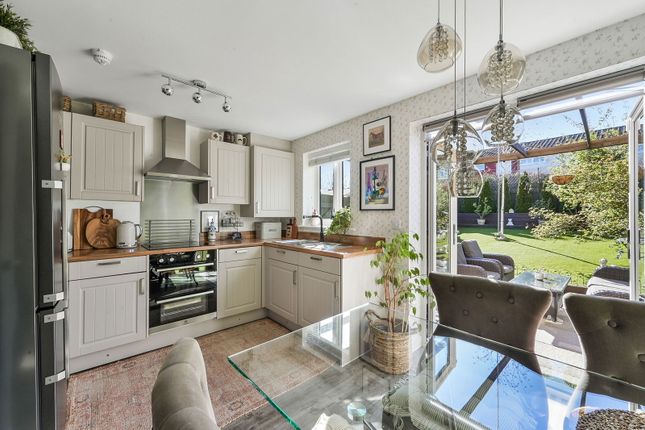 2.67m (Max) x 2.61m (Max) (8' 9" x 8' 7") Inset spotlights to ceiling, a range of matching wall and base units, granite worksurfaces, inset sink with mixer tap, integrated oven, four ring induction hob, extractor hood, integrated fridge, tiled walls, radiator, granite tiled flooring, uPVC door to: