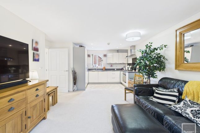 At the heart of the property lies the open-plan living and dining area, a naturally light-filled space designed to accommodate both relaxation and entertaining with ease. Large windows allow daylight to pour in, enhancing the sense of openness and creating a comfortable setting for everyday living. The layout flows seamlessly into the adjoining kitchen, which has been fitted with a range of units providing ample storage and worktop space, with space for a tumble dryer or dishwasher. Integrated appliances include an oven and fridge/freezer, alongside a washing machine, ensuring the space is as functional as it is practical.