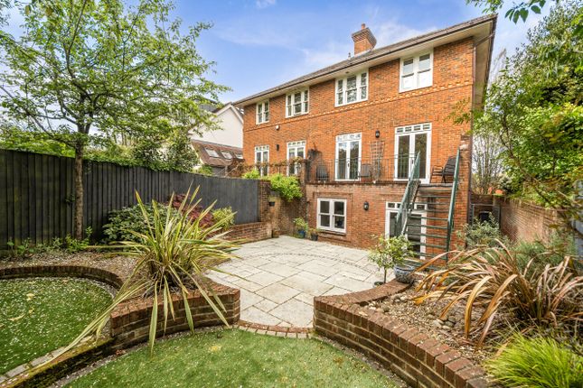 This beautifully presented semi-detached townhouse provides an excellent floor plan over three floors. The ground floor has a welcoming entrance hall with a cloakroom and stairs that rise to the upper floors. To the back of the house is a Kitchen/Breakfast Room re-fitted with a range of sleek white high gloss kitchen with slimline quartz countertops, twin ovens, induction hob, fridge, freezer and dishwasher and a peninsular unit with a breakfast bar. There is a window to the rear garden and French doors that open into the garden. The kitchen has a further range of units with an under-counter wine fridge. This space opens to the sitting/dining room, with a window to the front aspect. The first floor has a drawing room which is a spacious dual aspect room, with a Juliet balcony to the rear aspect. There is also a wall of bespoke fitted cupboards providing excellent storage. A double bedroom with adjacent cloakroom completes this floor. A turning staircase rises to the second floor with a side aspect window providing excellent natural light. There are three bedrooms: The principal having a refitted ensuite shower room, two further bedrooms are served by a family bathroom. The well screened front garden has a path to the front door. There is a south facing rear garden which is largely terraced for ease of maintenance with a small lawn, shrub borders, and a garden store. Gated access opens to two demised parking spaces.