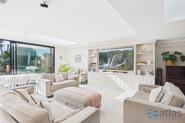 The bright and airy lounge features wood-effect Karndean flooring and a modern media wall with an integrated electric fireplace. Decorative finishes continue throughout, alongside a gas central heating radiator and built-in Control4 speakers. A double-glazed roof lantern and bi-folding doors flood the space with natural light while enhancing the sense of openness. The dining area enjoys two double-glazed side windows and continues the wood-effect Karndean flooring. Finished with decorative skirting, architrave, and ceiling coving, the space also benefits from a gas central heating radiator and integrated Control4 speakers, making it ideal for entertaining.