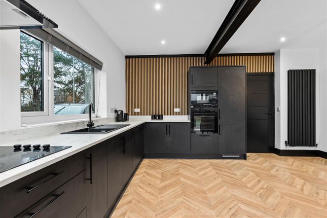 Fitted with wall and base units with worktop over, sink and drainer with mixer tap, double oven/hob with extractor hood over, integrated fridge freezer, space for washing machine, tumble dryer and dishwasher, tiled flooring, part tiled walls, window to rear, door to side.