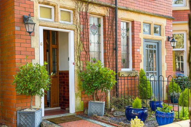 The property is a double-bayed mid-terrace home with attractive facing brick elevations and a restored bath-stone bay. The roof is slate with a tiled gable. There is a walled forecourt garden with decorative floral borders and artificial grass. A checkerboard paved pathway leads to the attractive entrance, which features a composite front door and outside porch light.