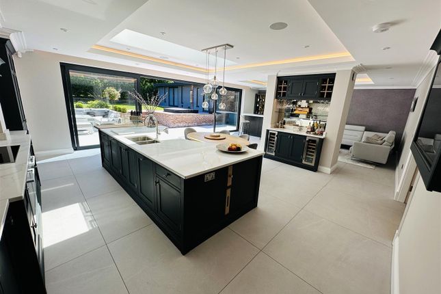The bungalow itself is approached via a central reception hall leading through to a spacious living room overlooking the rear gardens. An adjoining dining room opens into a separate garden room, both enjoying views across the gardens. The kitchen is fitted with a comprehensive range of units and overlooks the front of the property, complemented by a large utility and boot room which serves as a practical everyday entrance. The bedroom accommodation is well arranged, with one wing comprising a generous principal bedroom with adjoining dressing room (formerly a fifth bedroom), a further double bedroom and the house bathroom. A separate inner hallway to the rear leads to two additional double bedrooms and a well appointed shower room.