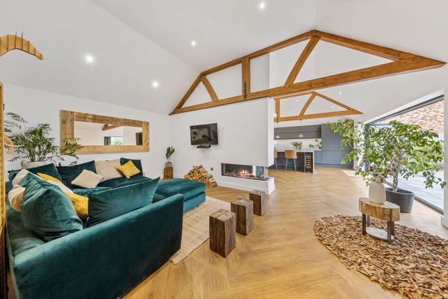 The heart of the home is the stunning open-plan kitchen, complete with a substantial central island and bi-fold doors opening onto the garden, seamlessly blending indoor and outdoor living. A separate dining room to the rear further enhances the entertaining space, enjoying pleasant views over the garden. A garage adds further practicality.