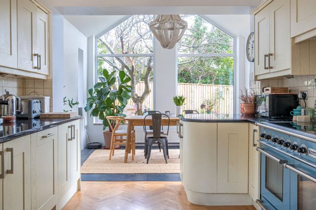 This is a spacious room benefitting from a triple aspect with double glazed windows offering a delightful outlook over both the front and rear gardens. The kitchen is fitted with a good range of matching base and eye level units with a run of matching wall mounted glass fronted display units. It benefits from having ample quartz work surfaces with tiled splashbacks, inset one a half bowl stainless steel sink unit with drainer and swan neck tap, inset four burner gas hob with integrated extractor fan with filter and light above and built in electric double oven with grill situated below. Radiator with thermostat control, serving hatch leading through to the dining room, space for table and chairs, matching picture rail and wood beams to ceiling. Door to rear lobby and further door to Utility providing space and plumbing for washing machine, wall mounted gas fired boiler serving the central heating and domestic hot water. Wall mounted timer control panel, coat hooks and (truncated)