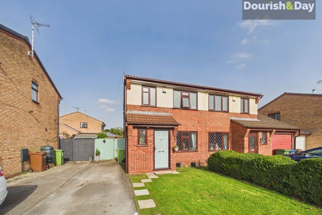 The front exterior presents a neat, well-maintained brick-built home with a sheltered entrance porch, a bay window to the living room, and a tidy front lawn bordered by a paved path leading to the front door. This end-of-terrace property enjoys a corner plot location with additional side lawn space.