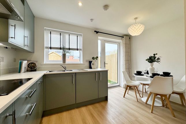 Range of modern fitted wall and base level units with rolled edge worksurfaces, stainless steel sink and drainer, space for cooker, space and plumbing for a dishwasher and fridge/freezer, part tiled walls, tiled flooring, double glazed window to front aspect, doors to dining room and utility area.