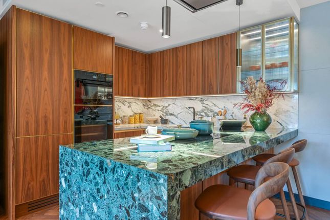 This impressive three-bedroom, two-bathroom apartment offers a contemporary lifestyle in a beautifully designed living space. The heart of the home is a generous open plan living and dining area, seamlessly connected to a modern kitchen featuring a central island with integrated appliances. This sociable space is ideal for family gatherings or entertaining friends, with large windows filling the room with natural light and sophisticated gloss tiles and herringbone flooring adding a touch of elegance. The living area extends directly onto a spacious private balcony. All three bedrooms are well-proportioned, with the primary bedroom boasting its own en suite bathroom.