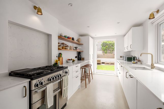 To the rear, the property boasts a stunning fitted kitchen featuring sleek marble flooring and worktops, along with ample space for cooking and entertaining. The ground floor further benefits from a modern shower room and a separate utility area. This leads onto a generous private garden, which enjoys evening sun, is not overlooked to the rear, and offers a peaceful, secluded setting.