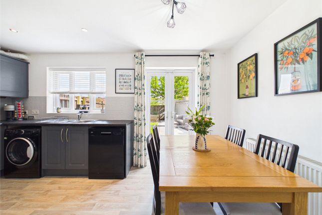 The ground floor is accessed through a welcoming entrance hallway that leads directly into the primary living spaces. At the front of the home, a bright living room features a classic bay window that fills the area with natural light. A separate, well-proportioned dining room provides a dedicated space for meals and social gatherings, also housing the staircase to the upper level. To the rear, a modern kitchen is equipped with workspace and storage, while a separate WC is located at the very back of the building and is accessed externally from the garden.