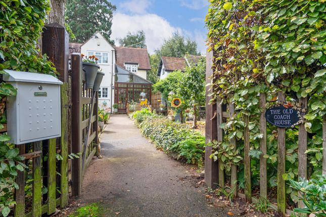 Garden to the front with a hedge boundary, established trees and bushes, and a pathway leading to the front door. The lawn wraps around to the side of the property providing gated access to the parking and garage at the rear.