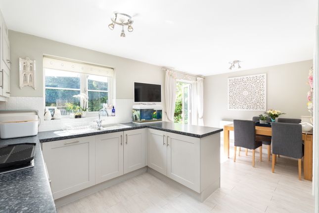 Set back from the road, the property benefits from a large driveway providing off-street parking for three or more vehicles. Inside, the ground floor is thoughtfully arranged to suit modern family living, with a separate lounge and dining room complemented by an impressive open-plan kitchen and family area. This expansive space is flooded with natural light from Velux roof windows and features two sets of doors opening directly onto the garden, creating a seamless indoor-outdoor flow. A substantial utility room and a convenient ground floor shower room/WC make this home particularly practical for families with children and pets.