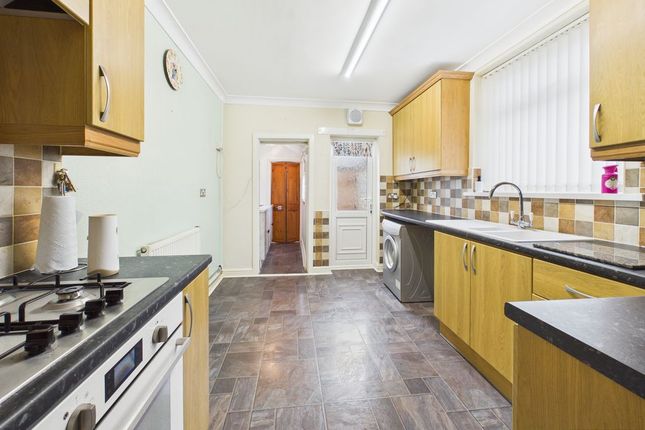 UPVC double glazed window, and tiled flooring. Fitted with a range of floor and eye level units, worktop with splashback tiles above, sink with mixer tap, a washing machine, and integrated oven with hob above.