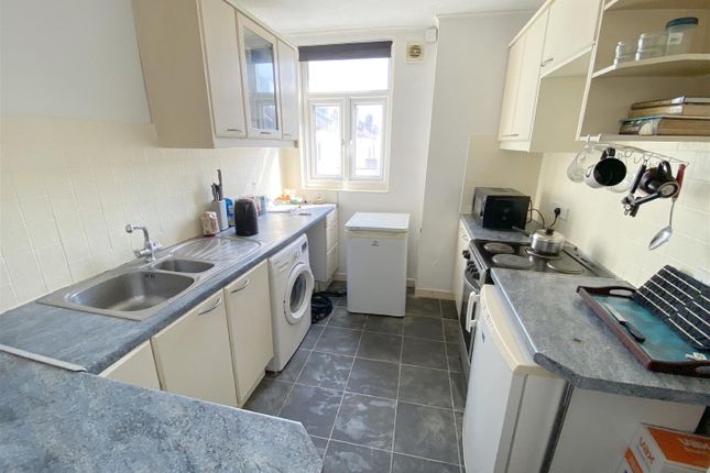 The accommodation further comprises a fully fitted three-piece bathroom suite with a shower over the bath and a window providing natural ventilation. To the rear, the generous kitchen is well-equipped with wall and base units, a recessed sink, integrated oven and gas hob, and space for white goods. There is also ample room for a dining table, making it a versatile and functional space.