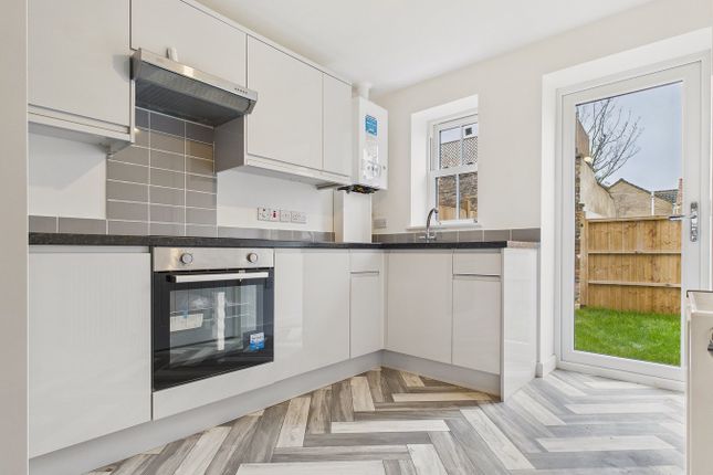 UPVC double glazed windows to front and rear, wall mounted double panel radiator wall and base units under round edge worksurfaces, sink drainer inset with mixer tap over, 4 ring gas hob inset to worksurface with extractor over and oven under, space for washing machine, wall mounted gas central heating boiler, tiled flooring.