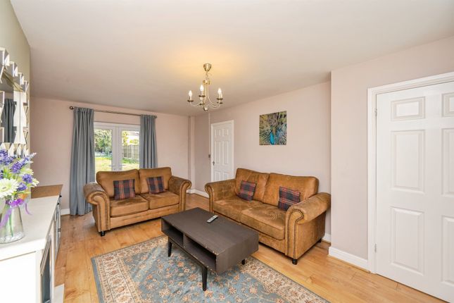 The property is approached via a driveway providing off-road parking, complemented by a small lawned foregarden. Entry is gained through the front door into a welcoming hallway, giving access to the main living areas. To the left sits a bright and spacious bay-fronted lounge, offering an inviting space to relax. To the rear of the home is a separate dining room, ideal for entertaining, with double doors opening onto the rear garden and allowing plenty of natural light. Adjacent to the dining room is a practical galley-style kitchen, offering ample worktop and storage space.