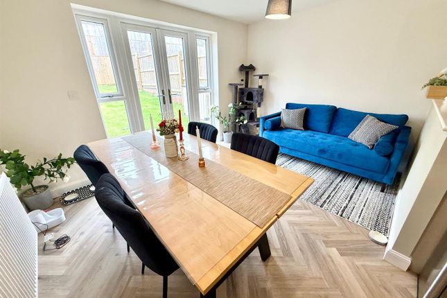 To the rear, the home opens up into a spacious open plan dining kitchen — a layout that suits modern living well. The kitchen has been updated in a Shaker-style design, fitted with a range of wall and base units, wood-effect worktops, integrated oven and gas hob, and ample workspace. There’s plenty of room here for both dining and relaxing, with French doors opening directly onto the rear patio and garden beyond, helping the inside and outside connect nicely during the warmer months.