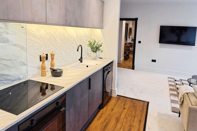 The open layout combines a spacious lounge and a fully fitted kitchen, designed with luxurious specifications including contemporary handleless cabinetry, high-quality worktops, matching upstands and splashbacks, a stainless steel integral sink, induction hob, and LED strip lighting under the wall units-ensuring a sleek, modern aesthetic throughout.
