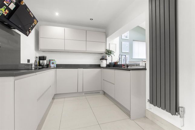 The lounge is a bright and welcoming space with neutral carpeting and direct access to the rear garden through the French double doors. Two attached full height windows provides natural light, creating a comfortable area for relaxation and entertaining. Built in storage cupboard and two radiators.