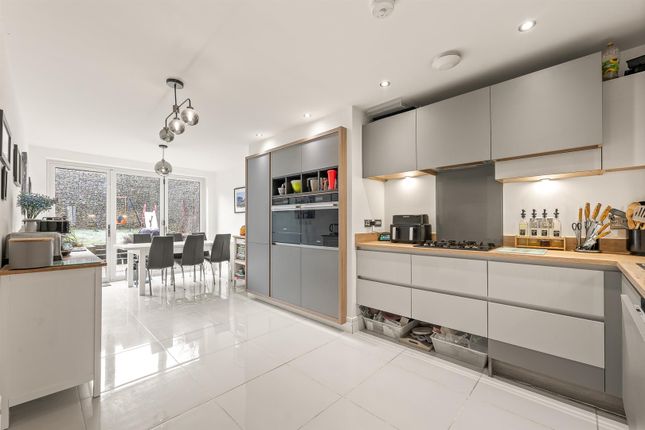 A welcoming entrance leads into the heart of the home, where a spacious lounge features a bay window, filling the room with natural light and adding character. The contemporary open-plan kitchen/dining area forms the centrepiece of the home, with a striking central island – perfect for entertaining. The luxury German-designed kitchen is complemented by high-specification Neff and Miele appliances, while bifold doors open onto the landscaped rear garden with a paved patio. Additional utility storage and a stylish downstairs WC enhance