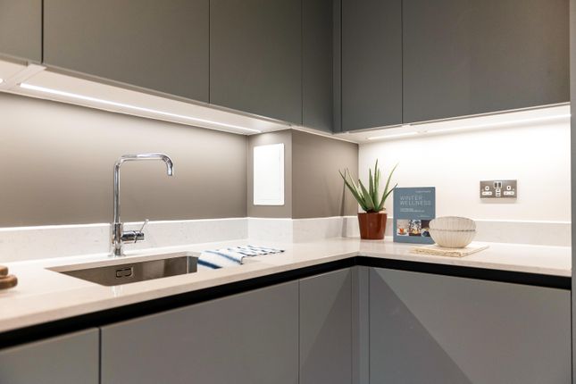 This one bedroom first floor apartment in Mundell House benefits from a private terrace. The kitchen has integrated appliances including fridge freezer, induction hob, extractor hood and a dishwasher plus a freestanding washer dryer housed in its own hallway cupboard. The bedroom includes a spacious mirrored wardrobe and the contemporary bathroom has a full-sized bath with shower, WC, a wash basin, chrome towel rail and a vanity mirror cabinet with LED light and sensor switch.