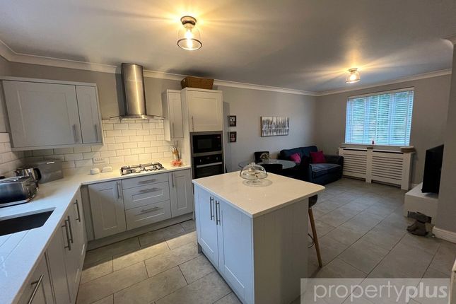 Double glazed French doors to front, D/G window to rear, dark cupboards and wall units, worktops, mixer taps, stainless steel gas hob, oven and extractor fa, stainless steel half bowl and drainer, integrated fridge freezer, power points x11, radiator, vinyl to floor