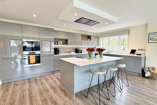 The kitchen is fitted with a painted shaker-style design featuring 18mm cabinetry, finished with elegant 30mm marble quartz worktops. A comprehensive range of integrated Neff appliances is included, comprising a Neff oven, Neff combination oven, Neff warming drawer, Neff induction hob, Neff 70/30 fridge freezer and Neff dishwasher. The space is further enhanced by LED pelmet lighting and designer hanging island lights, creating a stylish yet practical kitchen and dining environment ideal for both everyday living and entertaining
