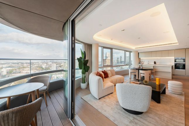 Positioned on the 19th floor, the apartment enjoys an abundance of natural light and offers a spacious open-plan kitchen and reception area. The contemporary kitchen is beautifully finished with quartz worktops and splashbacks, alongside fully integrated appliances including an extractor hood, fridge freezer, and dishwasher. A separate utility area provides space for a washing machine and tumble dryer. There is also a private terrace with stunning views.
