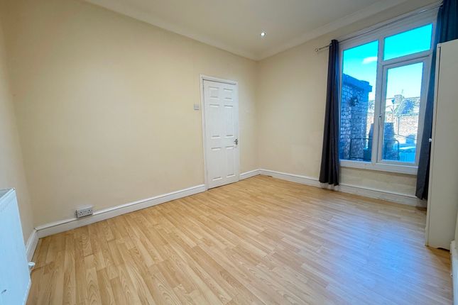 A fully tiled bathroom with a shower over the bath. A double bedroom with french doors leading to shared rear garden.