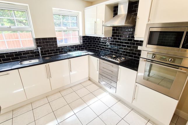 A stylish modern kitchen with bay window overlooking front aspect. Fully fitted kitchen with upper and lower units. Tiled splashback and breakfast bar. Neutral decor and flooring. Double doors opening into lounge/dining room. Gas central heating radiator.