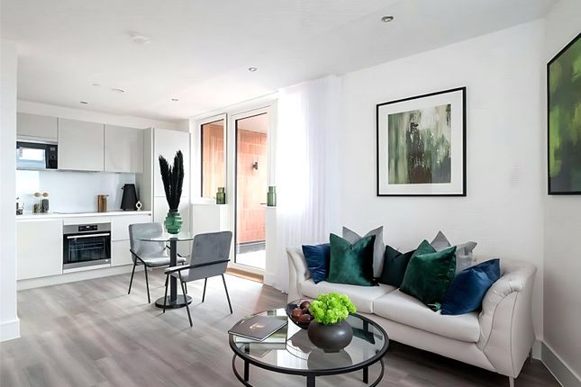 The expansive living room is a highlight of the flat, offering a bright and inviting space that seamlessly connects to a fitted kitchen equipped with modern integrated appliances. This open-plan layout creates a perfect environment for both relaxation and entertaining.