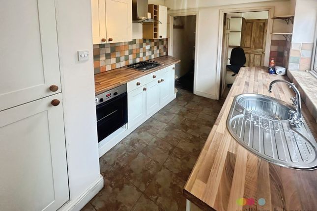 Featuring UPVC double glazed door through to conservatory, UPVC double glazed window to rear aspect, range of base and eye level units with white doors and wood effect worktops, stainless steel sink with separate drainer and mixer tap over, fitted chrome electric oven, chrome gas hob with extractor unit above, space and plumbing for washing machine as well as fridge and/or freezer, wood effect vinyl flooring fitted to kitchen and grey carpet fitted to dining area, and wall mounted radiator.