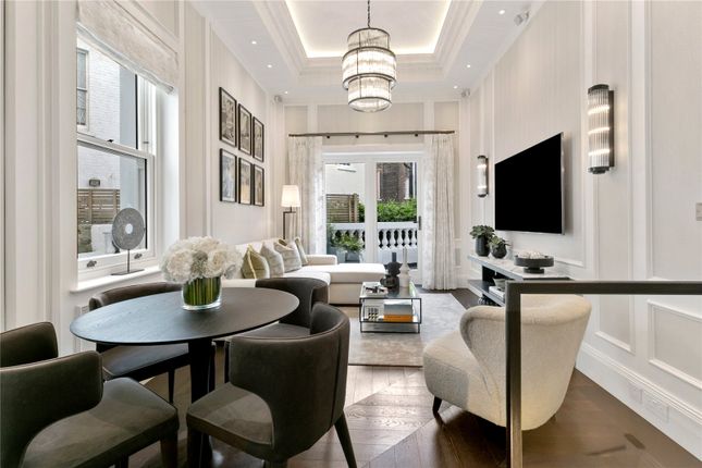 In the top-floor reception room and kitchen, an abundance of natural light filters through four skylights in the vaulted ceiling. Neutral tones and restrained interior design courtesy of Golborne 44 produce an uplifting feel. Completely bespoke, the kitchen’s Arabescato rose marble worktops unite a Smeg hob, Abode sink and Studio Ore tap. Smooth micro-cement flooring flows into a comfortable living area filled with modernist design classics, including Charlotte Perriand wall lights and an original 1970s Mario Bellini sofa. When you need to take a breather, a trio of doors lead to an L-shaped roof terrace with cityscape views.
