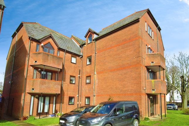 The property comprises entrance hall with cupboard space, large living room with door to balcony, fitted kitchen, 2 double bedrooms, bathroom with shower over, double glazing, ample parking and large lawned communal gardens.