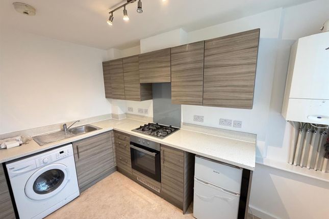 Offered unfurnished, the property features a bright south-facing living room with sliding doors opening onto a private patio, a contemporary open-plan kitchen complete with integrated washing machine and fridge freezer, a stylish part-tiled bathroom with shower over bath, and a spacious south-facing double bedroom.