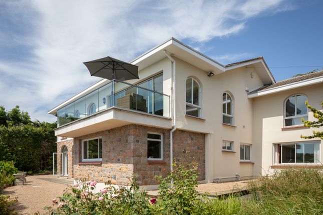 An impressive gated residence measuring approximately 3600sqft. Situated in rural St Helier on the border with Trinity, enjoying southerly rural views to sea views down to St Helier, on a quiet residential lane and nestled behind electric gates. On opening the front door the first impression is of grandeur with the wide hall and curved staircase. Large living room, kitchen with sitting area and conservatory, study, large utility, integral double garage and an external office/room to the rear of the property. To the first floor are 4 en-suite double bedrooms (one was formerly a separate studio), and a 5th smaller bedroom. A sun room and sun terrace is accessed from the master bedroom. A short drive 5 min to St Helier, 15 mins to airport. This property can be rented part furnished at £8,500pm.