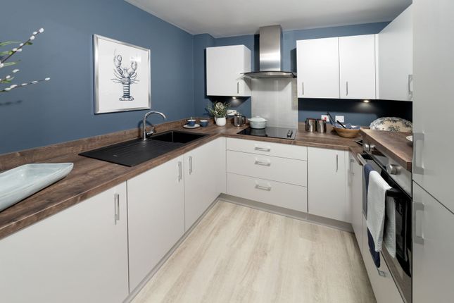 The spacious living room is decorated in a natural colour which gives a bright and airy feel. The open plan kitchen off the living room has been thoughtfully designed with ample work surface and storage and includes an oven at waist height, plus an integrated fridge freezer.