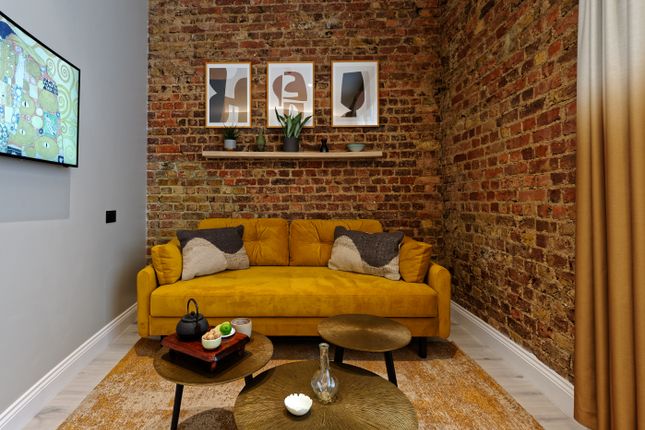 Behind a blonde-brick and stucco façade, this one-bedroom apartment unfolds with poise. Ascend steps to the raised ground level, where deep wooden floors draw you into the reception and dining space. Softness and scale are thoughtfully balanced here – tall sash windows, soaring ceilings and a muted palette. A four-seat dining table sets the stage for intimate evenings hosting, while the velvet sofa invites leisurely afternoons.
