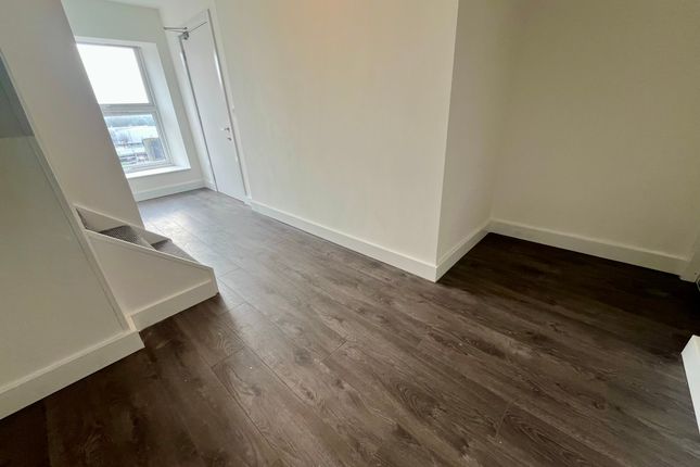 A modern open-plan lounge and kitchen featuring laminate flooring and a double-glazed window overlooking the front elevation. The kitchen is fitted with a range of contemporary wall and base units, complemented by work surfaces. Integrated appliances include a fridge/freezer and washer/dryer, along with an electric oven, hob with extractor hood above, and a stainless steel sink with mixer tap.