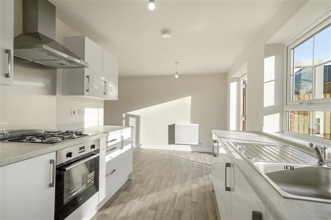 The kitchen/diner offers a well-lit, practical space fitted with modern cabinets in a muted shade, complemented by wood-effect flooring. A built-in oven and four-burner gas hob are integrated seamlessly, while the space provides ample room for dining and access to the rear garden via double doors.