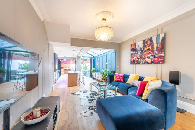 The ground floor opens into a striking open-plan kitchen and reception area, designed for both everyday comfort and entertaining. With sleek cabinetry, integrated appliances, and a central island that doubles as a breakfast bar, the kitchen flows seamlessly into the living and dining zones. Large windows and sliding doors connect the space to the garden, creating a bright, sociable hub with a strong indoor-outdoor feel. Also on the ground floor is a separate room that could serve as a bedroom, study, or snug, alongside a utility room tucked away for practicality. Upstairs, the first floor offers two further bedrooms and a family bathroom, while the top floor is dedicated to a spacious loft-style bedroom with useful eaves storage.
