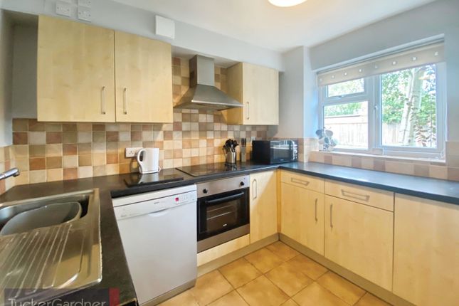 The kitchen is fully equipped with a tall free standing fridge freezer, a washer dryer, an integrated hob and oven, and generous cupboard and worktop space.