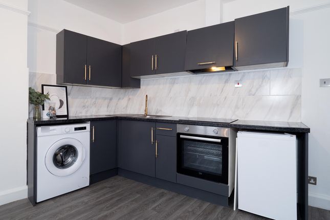 Access is via a communal entrance and stairs to the second floor entrance. The property is unfurnished. The living room provides wood effect flooring, pendant light fitting and window to the side elevation. The bedroom also provides wood effect flooring with pendant light fitting and window to the garden. The bathroom provides a white suite bath with hand held shower, WC and wash hand basin on pedestal and velux window over. The kitchen has an electric oven with hob, washing machine and under counter fridge.