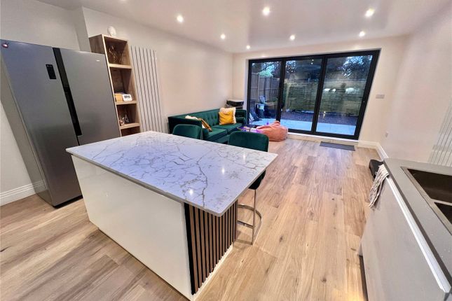 The spacious open-plan living area showcases wood-effect flooring, ambient LED lighting, and a modern kitchen fitted with high-end integrated appliances. A full wall of bi-fold doors opens onto a beautifully landscaped south-facing private garden, perfect for relaxing or entertaining. The garden includes a paved patio ideal for alfresco dining and a low-maintenance artificial lawn, enclosed by wooden fencing for privacy.