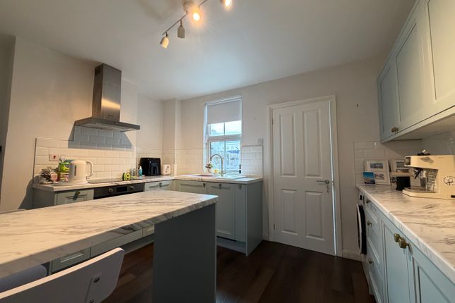 To the right, a cosy living room with bay windows and Venetian blinds which create a warm and inviting atmosphere. This flows seamlessly into the dining room which accommodates a six-seater table, and then onward into the modern, fully fitted kitchen.