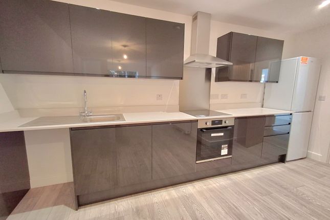 The apartment features a contemporary open-plan living area, complemented by a fully fitted modern kitchen with integrated appliances including a fridge freezer, oven and hob, and washing machine. French doors from the lounge open onto a private balcony, providing a pleasant outdoor space and an excellent sense of light and space.