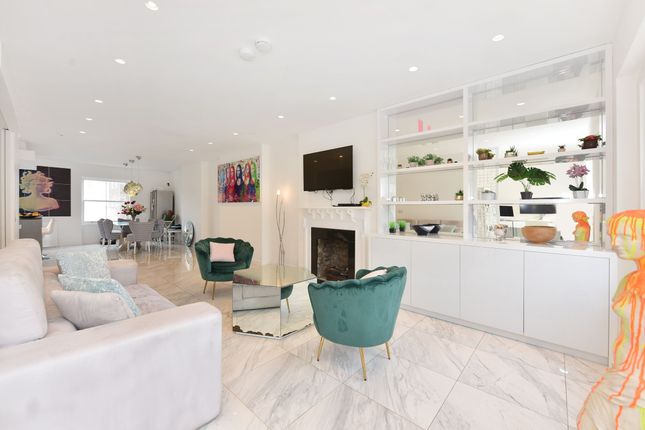 The reception room is a wonderful sweep of space, arranged for both dining and sitting, with a wall of tall sash windows framing classic townhouse rooflines. Decorative cornicing, pale flooring and considered lighting give the room an easy, welcoming feel, while its scale makes it equally suited to relaxed evenings or more formal gatherings. The adjoining kitchen continues the sense of lightness, designed around clean lines, stone surfaces and integrated appliances. A central island anchors the room, offering both workspace and a natural place to gather.