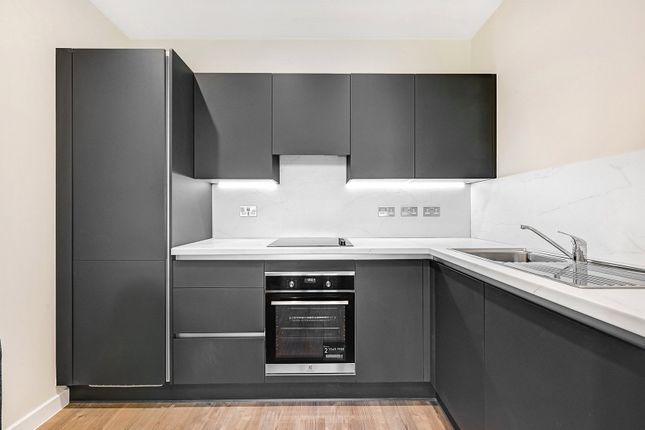 The apartment features a light-filled open-plan living area with a contemporary fitted kitchen, complete with integrated appliances and sleek cabinetry. The double bedroom is generously sized, offering a comfortable and practical living space, while the modern bathroom is finished with high-quality fittings and elegant tiling.